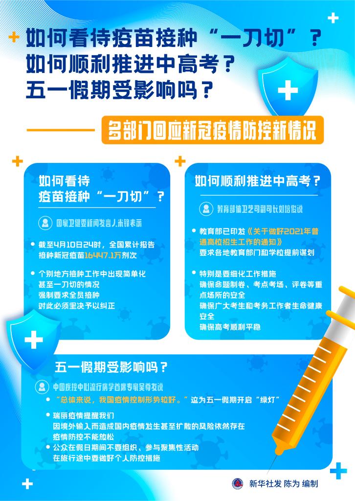 如何看待疫苗接种“一刀切”?如何顺利推进中高考?五一假期受影响吗?多部门在11日集中回应新冠疫情防控与疫苗接种新情况。