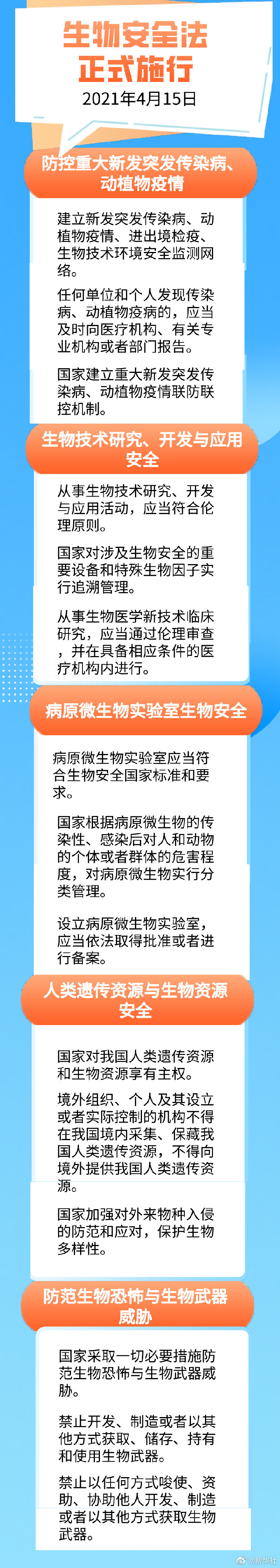 生物安全是国家安全的重要组成部分。生物安全法4月15日起正式施行,我国生物安全进入依法治理的新阶段。生物安全法全面规范生物安全相关活动,规定建立生物安全风险监测预警、风险调查评估、信息共享、信息发布等基本制度,构建起生物安全风险防控的“四梁八柱”。生物安全主要包括哪些方面?法律如何防范相关风险?戳图了解↓↓(记者张泉)