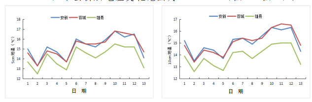 4月1日,雄安新区各地日平均气温稳定通过10℃,4月1日-13日日平均气温变化范围为10~15℃。耕层地温(5cm、10cm)稳定通过12℃,安新、容城耕层地温均高于雄县,变化范围为13~17℃,雄县耕层地温变化范围为12~15℃(图1、图2)。