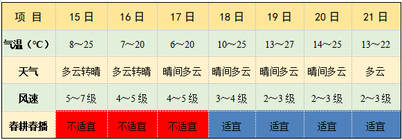 预计未来七天(4月15日-21日),大部时段以晴到多云天气为主。其中,15日-17日风力较大,并伴有沙尘天气,不利于春耕春播工作。
