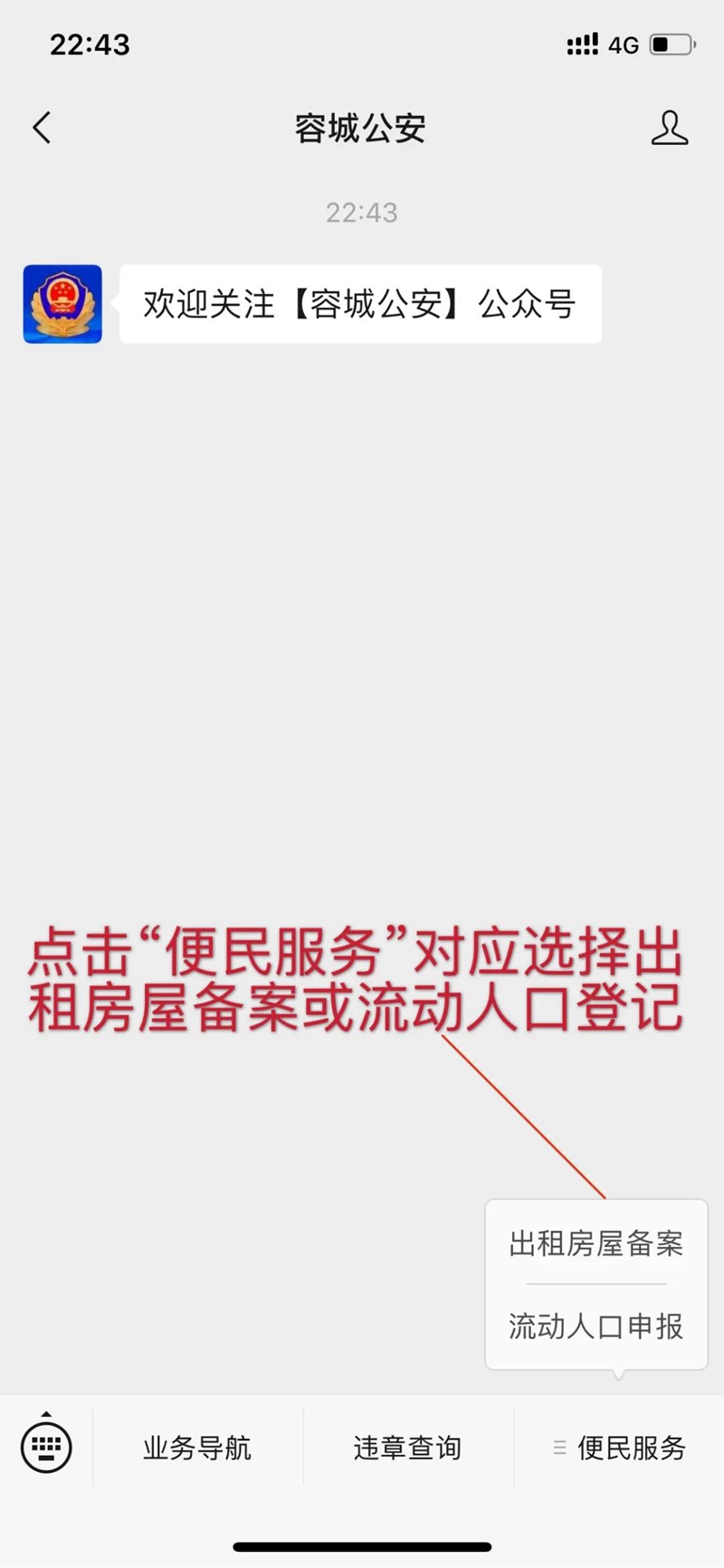 凡在容城县居住、工作、就学的外来人员,均可通过手机关注“容城公安”微信公众号,足不出户即可自助申请办理居住证。具体办理流程: