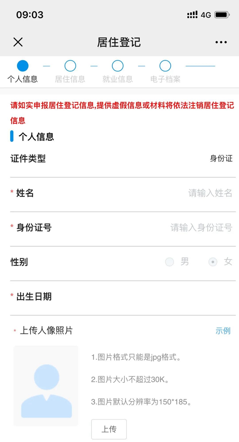 3、按要求填写真实信息并上传相关照片后,点击“提交”,即完成申报程序。属地派出所收到申报信息后将按照有关规定组织审核,经派出所核查申报信息属实符合办理条件,办理登记满六个月后,可到居住地派出所直接办理居住证。