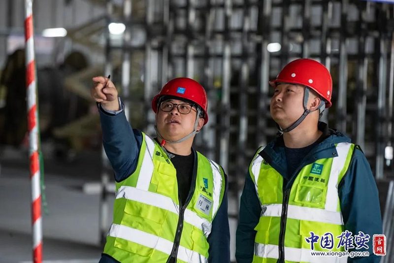 付林(左)与同事在会展中心项目现场工作。中国雄安官网记者高盟 摄