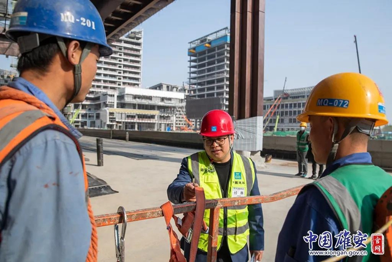 付林(中)与雄安建设者在项目现场沟通交流。中国雄安官网记者高盟 摄