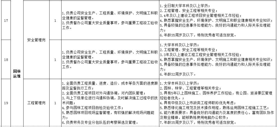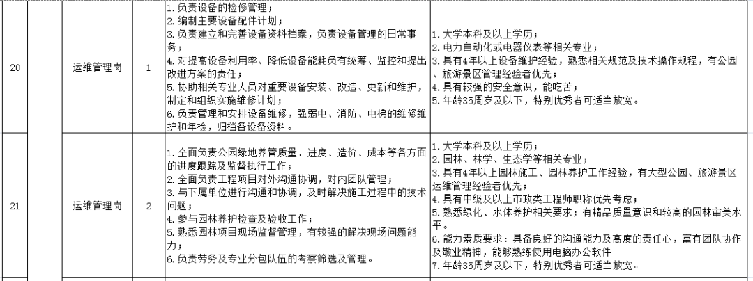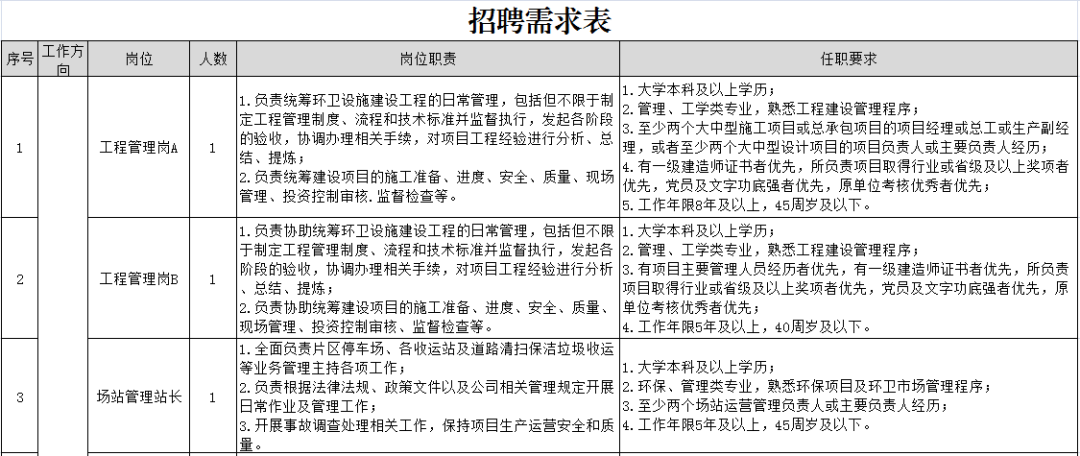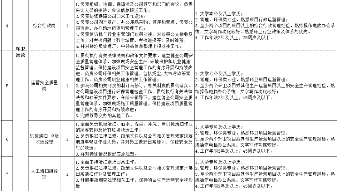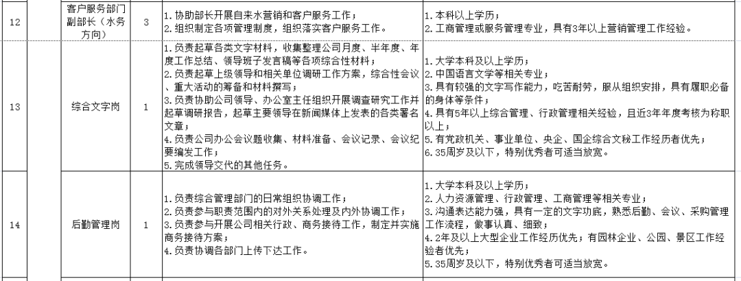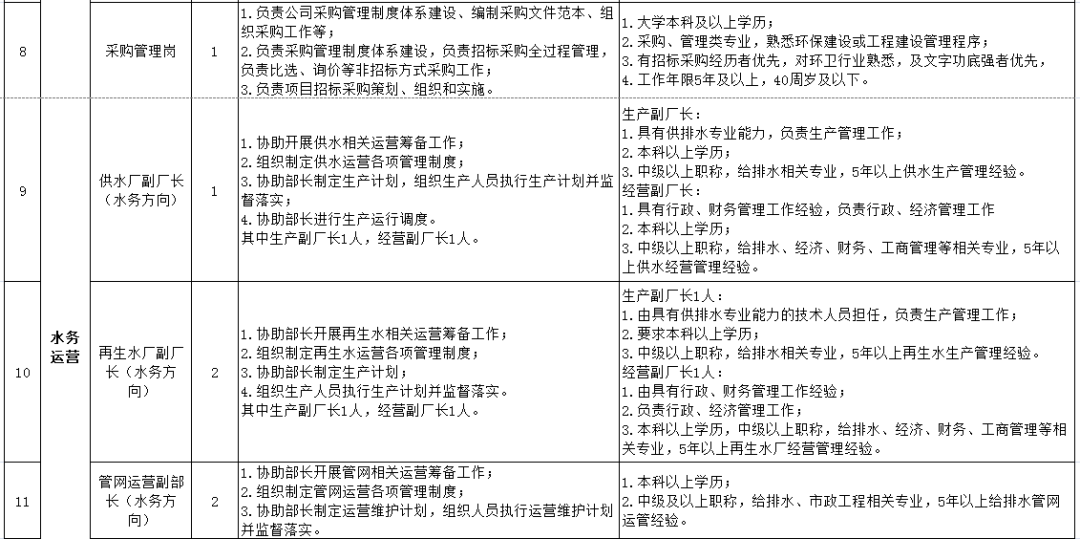 其中水务板块招聘人员主要负责协助开展供水厂管理、再生水厂管理、管网运营、客服服务等工作开展;园林绿化板块招聘人员主要负责协助园林绿化运维、开发运营工作开展;环卫板块招聘人员主要协助负责环卫设施建设工程的日常管理、环卫业务等工作开展。