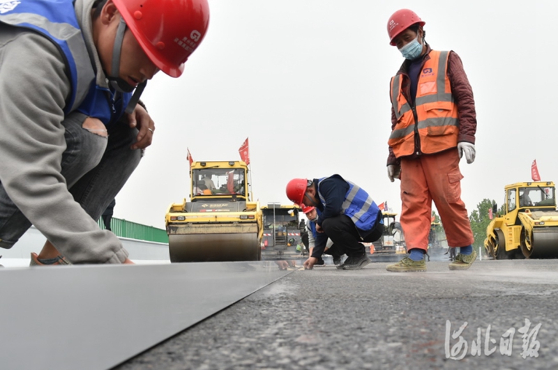 2021年4月21日,京德高速公路一期工程“永久路面”摊铺现场,工作人员认真测量路面平整度。河北日报记者赵海江 摄