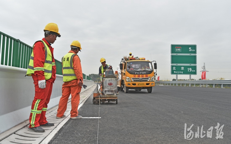 2021年4月21日,工人正在京德高速公路施划标线。河北日报记者赵海江 摄