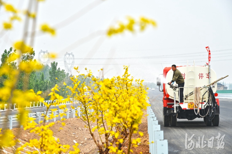 2021年4月21日,工人正在为京德高速公路绿化带新栽的植物浇水。河北日报记者赵海江 摄