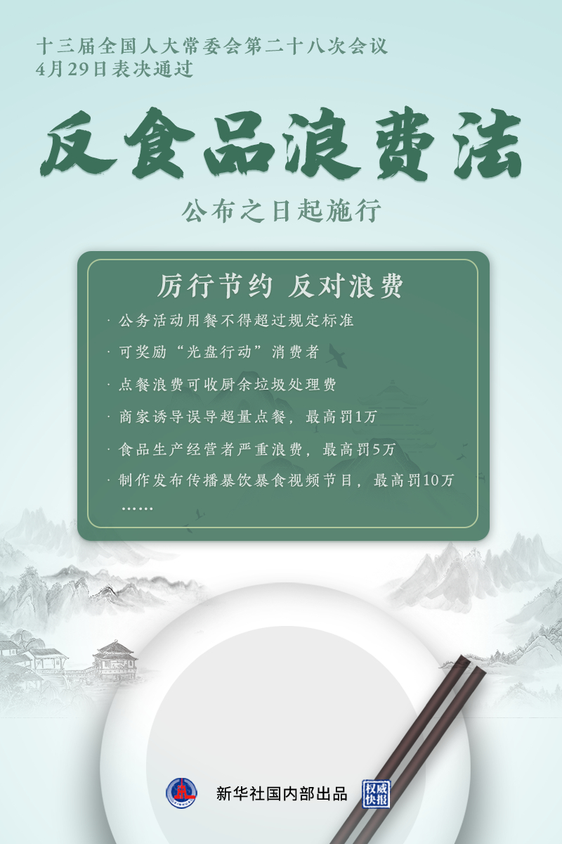 4月29日,十三届全国人大常委会第二十八次会议表决通过反食品浪费法,防止食品浪费从此有法可依。