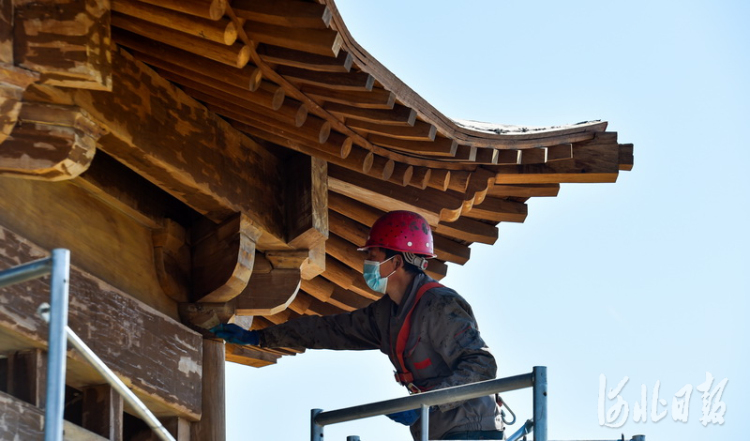 2021年5月1日,在雄安新区悦容公园建设工地,建设者在修缮观景亭。