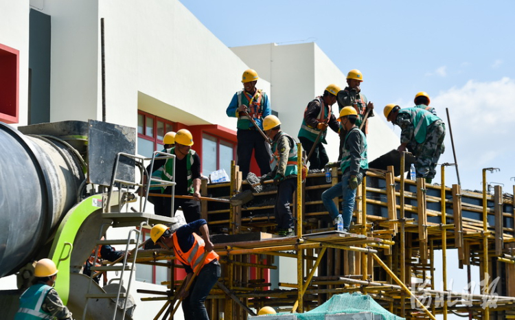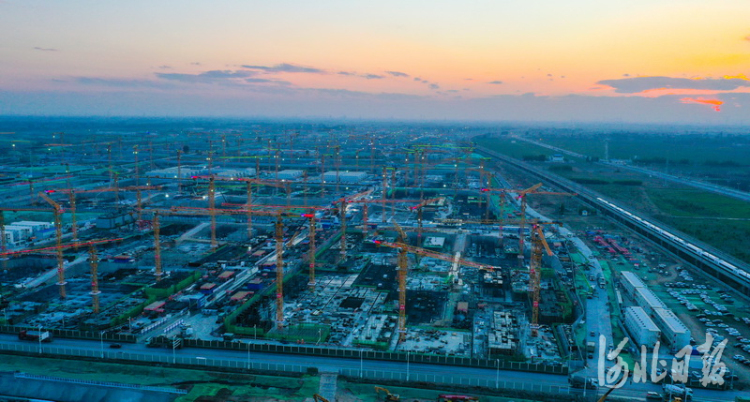 2021年5月1日,雄安新区容西片区安置房建设项目现场,建设者在紧张施工。