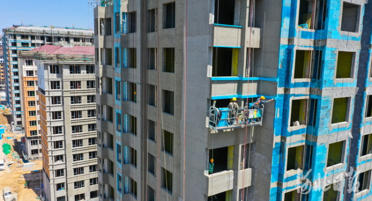2021年5月1日,雄安新区容东片区B1组团安置房建设项目现场,建设者在进行外墙面施工作业。