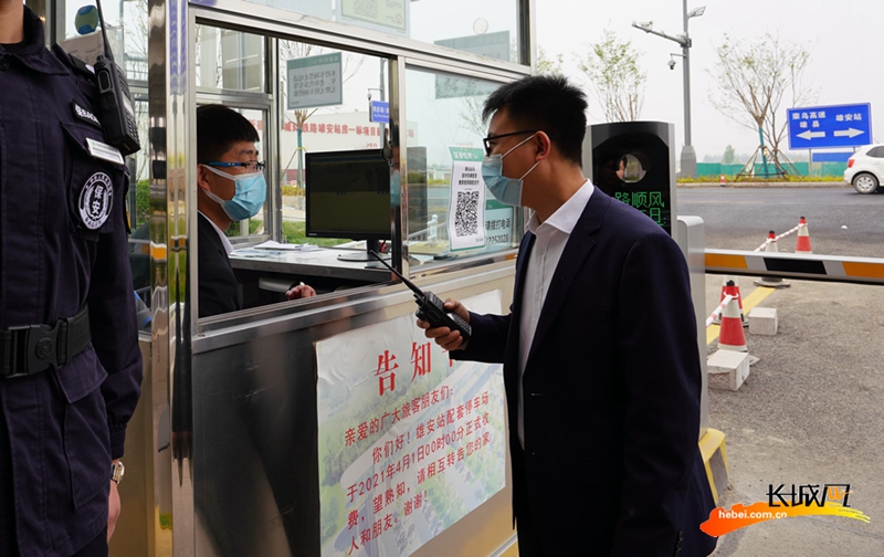 五一劳动节前,王雪超和雄安站CEC停车场工作人员沟通安全注意事项。长城网记者霍少轩 摄