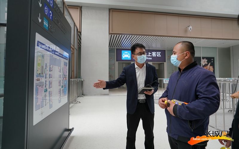 王雪超(左一)为雄安站乘客作出行讲解。长城网记者霍少轩 摄