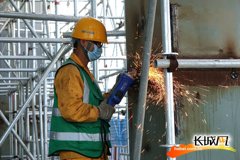 建设者正在切割钢柱。长城网记者霍少轩 摄