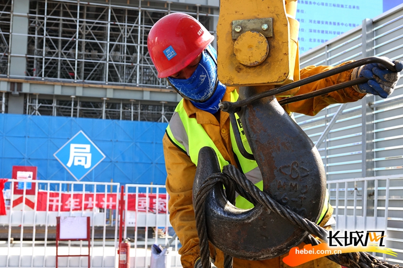 建设者正在将建材绳索捆绑在塔吊钩上。长城网记者霍少轩 摄