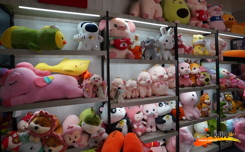“我们提供销售场地,把当地的厂子生产出来的毛绒玩具都统一归到这里。过去我们只搞电商,去年受疫情影响,为了扭转局面提高销售量,我们在抖音上开通了直播。”张靖说。
