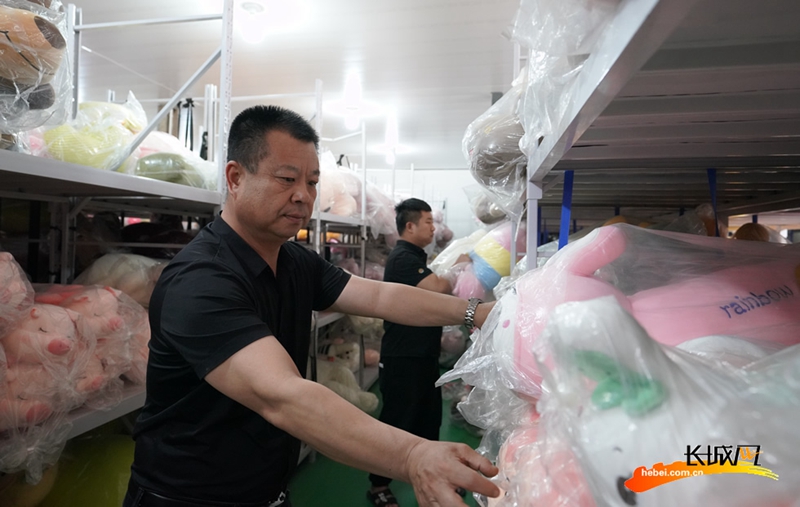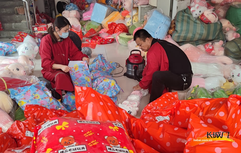 张靖和同事一起打包毛绒玩具。长城网记者霍少轩 摄