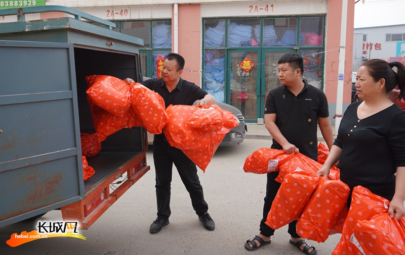张靖和妻子儿子将打包好的毛绒玩具放到快递车上。长城网记者霍少轩 摄