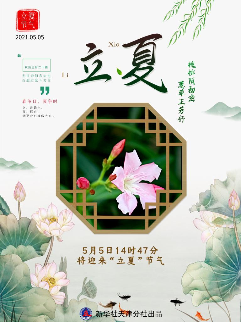 新华社天津5月3日电(记者周润健)“纷纷红紫已成尘,布谷声中夏令新。”《中国天文年历》显示,北京时间5月5日14时47分将迎来“立夏”节气。此时节,风暖昼长,绿遍山原,蜂飞蝶舞,万物并秀。