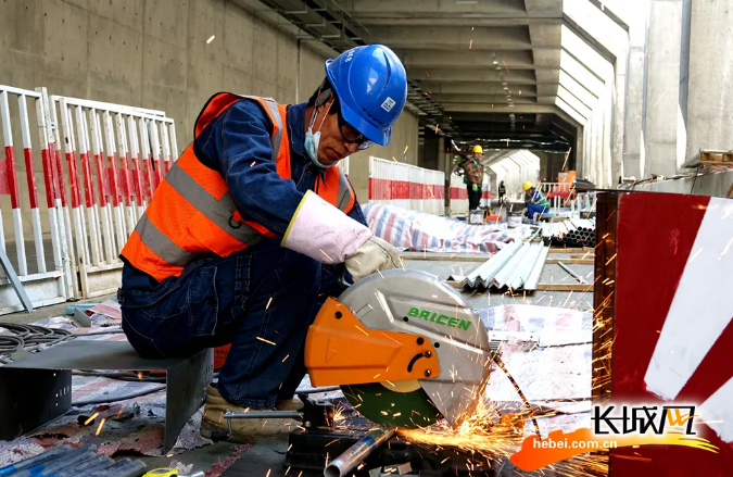 建设者正在切割钢管。长城网记者霍少轩 摄
