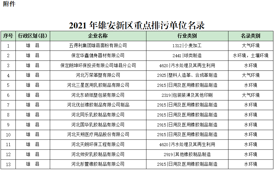 按照《企业事业单位名录信息公开办法》有关规定,现将调整后的《2021年雄安新区重点排污单位名录》予以公布,详见附件。