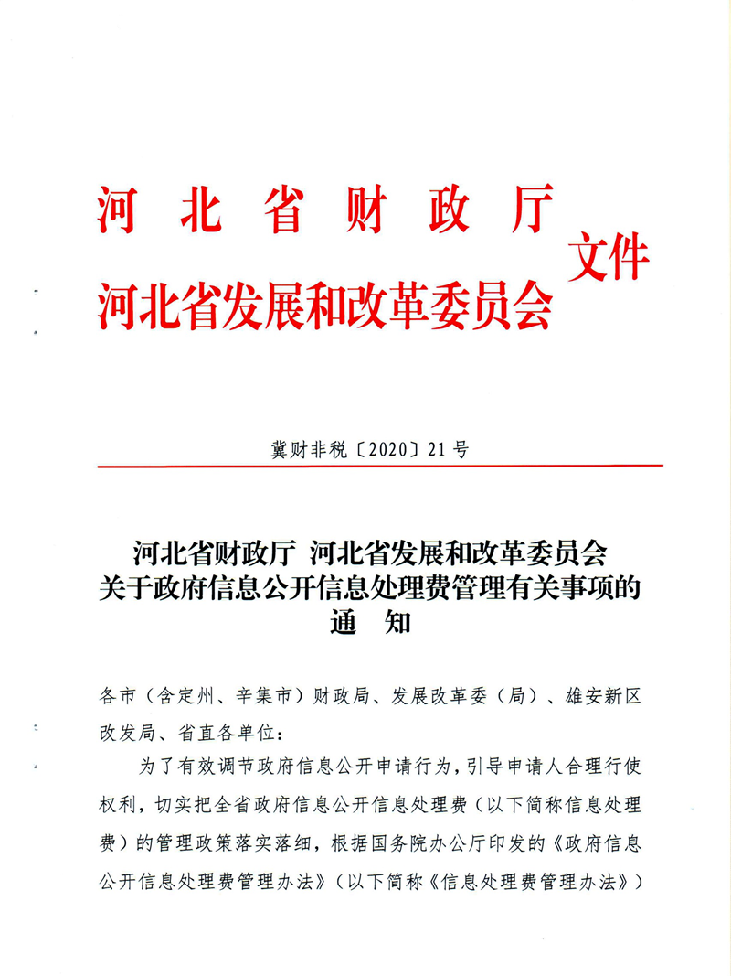 河北省财政厅河北省发展和改革委员会关于政府信息公开信息处理费管理有关事项的通知