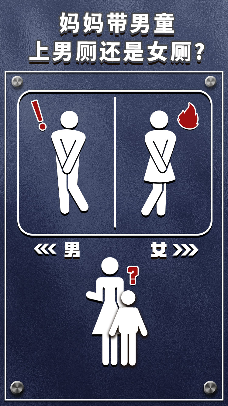 “妈妈带男童进女厕”很多时候是一种无奈之举。节假日带娃外出,爸爸不在身边,娃太小不会自理,妈妈或孩子想上厕所怎么办?景点、商场、车站等公共场所人流密集,让娃在外面等着着实不安全,带进女厕又会遭受到他人异样的眼光,真是让人左右为难!