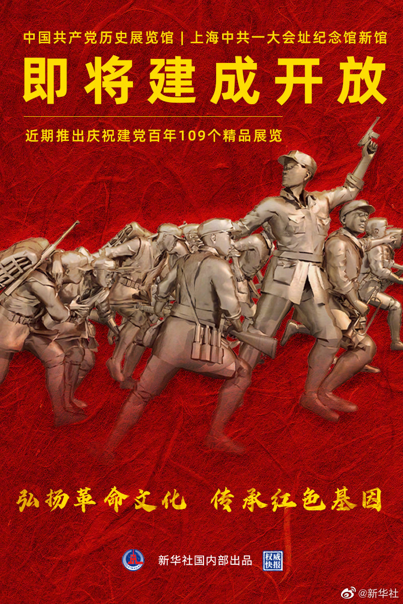 记者从19日举行国新办发布会上获悉,中国共产党历史展览馆和上海中共一大会址纪念馆新馆即将建成开放。国家文物局副局长顾玉才在发布会上表示,中央宣传部、国家文物局以“百馆百展颂百年”为主题,近期推出庆祝建党百年陈列展览精品系列,共推介了109个精品展览,覆盖全国31个省、区、市及新疆生产建设兵团。(记者施雨岑、黄玥,海报设计张晨光)