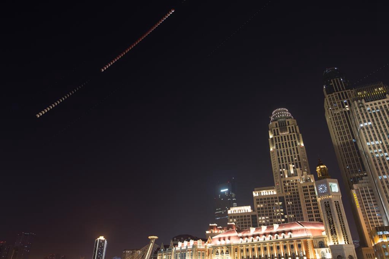天津市天文爱好者王硕2018年1月31日在天津津湾广场拍摄的“月食项链”照片。(王硕本人供图)