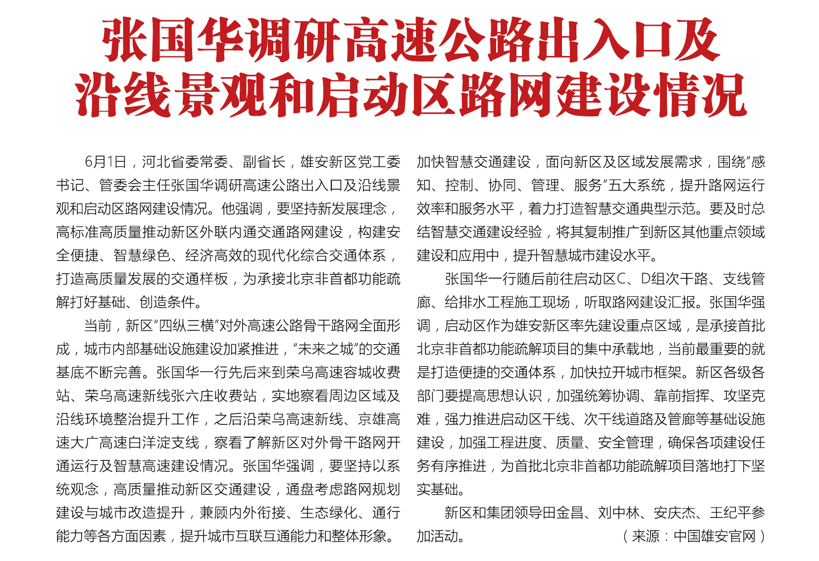 【雄安之声】张国华调研高速公路出入口及沿线景观和启动区路网建设情况