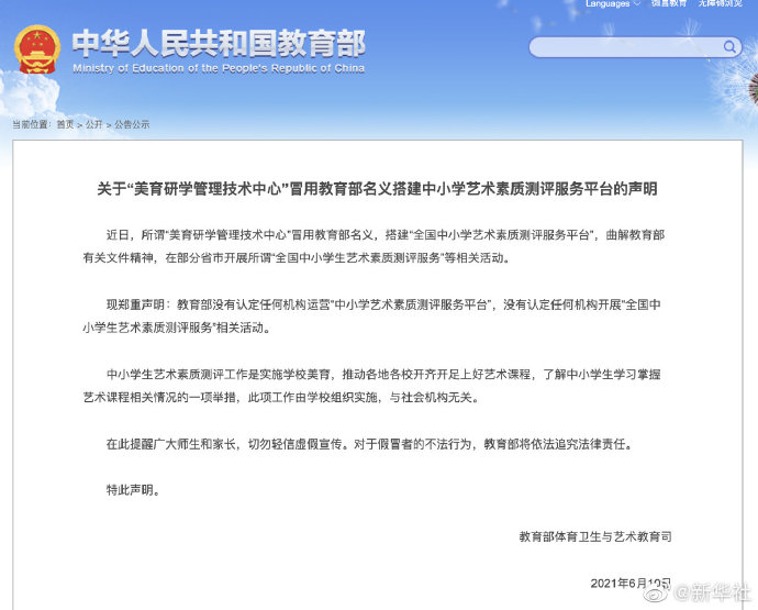 教育部10日发布声明称,近日,所谓“美育研学管理技术中心”冒用教育部名义,曲解教育部有关文件精神,在部分省市开展所谓“全国中小学生艺术素质测评服务”等相关活动。教育部声明表示,教育部没有认定任何机构运营“中小学艺术素质测评服务平台”,没有认定任何机构开展“全国中小学生艺术素质测评服务”相关活动。中小学生艺术素质测评工作由学校组织实施,与社会机构无关。教育部提醒广大师生和家长,切勿轻信虚假宣传。(记者胡浩)
