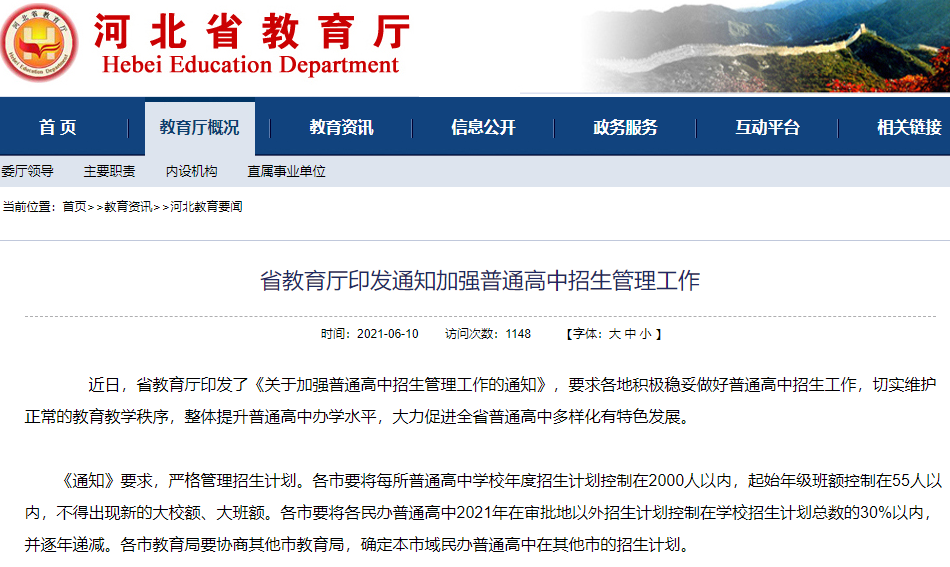 近日,河北省教育厅印发了《关于加强普通高中招生管理工作的通知》,要求各地积极稳妥做好普通高中招生工作,切实维护正常的教育教学秩序,整体提升普通高中办学水平,大力促进全省普通高中多样化有特色发展。