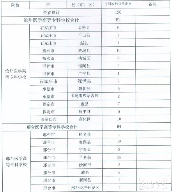 河北高考生注意啦!根据各地需求,经国家卫生健康委批准,今年我省本、专科农村订单定向免费医学生计划招生388人,其中本科262人(临床医学202人,中医学60人),专科126人(临床医学)。上学免学费,生活有补助。如何报名,赶紧看↓↓↓