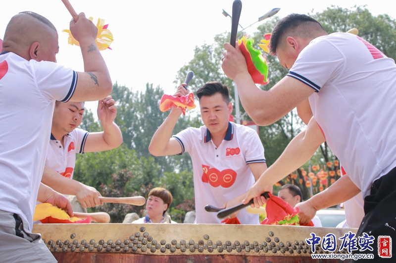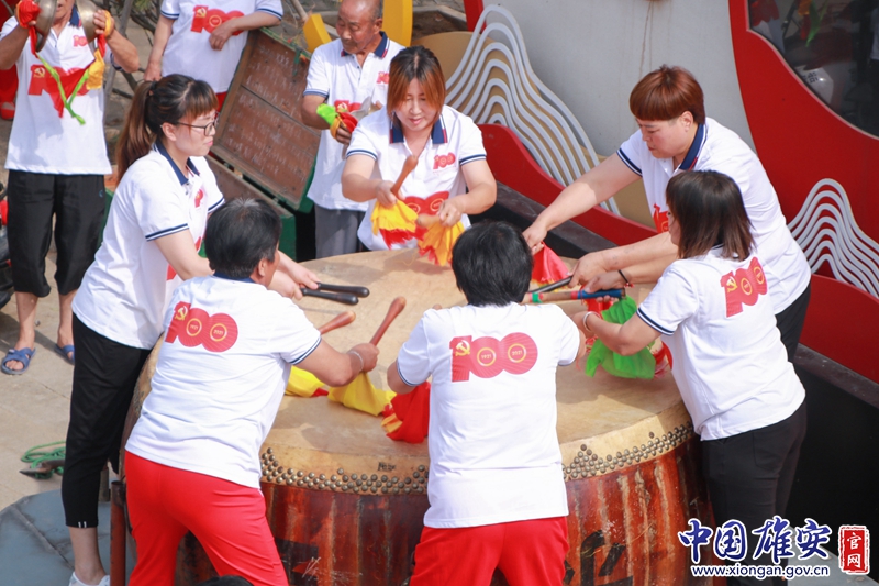 雄安新区安新县龙化乡拥城村庆祝建党100周年快闪活动现场。图为敲大鼓表演。中国雄安官网发