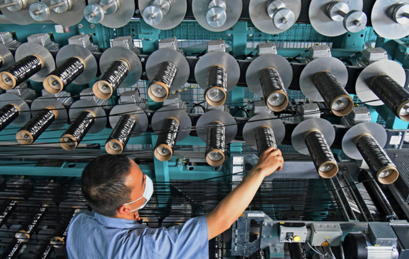 在江苏连云港经济技术开发区,工人在查看碳纤维生产线运行情况。新华社发(耿玉和摄)