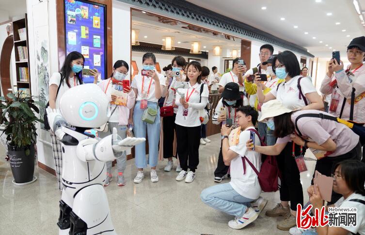 图为采访团在白沙村阅览室和小机器人互动。郭明明 摄