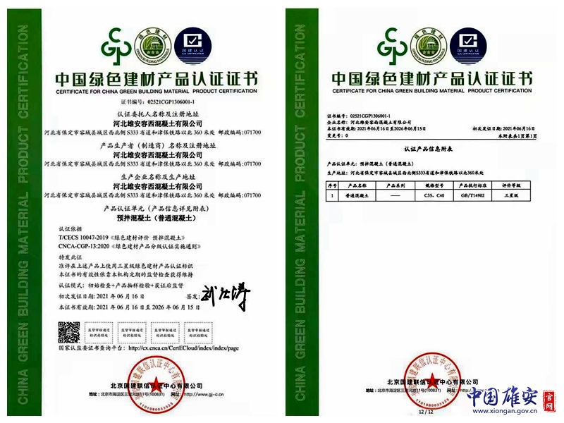 中国雄安官网6月22日电 近日,河北雄安容西混凝土有限公司荣获中国预拌混凝土行业首张“中国绿色建材产品认证证书”,编号001。据介绍,这是中国雄安集团落实绿色发展理念、高标准高质量建设雄安新区的重要成果,为创造“雄安质量”提供了有力保障,为中国雄安集团基础建设有限公司做优做强产业奠定了坚实基础。