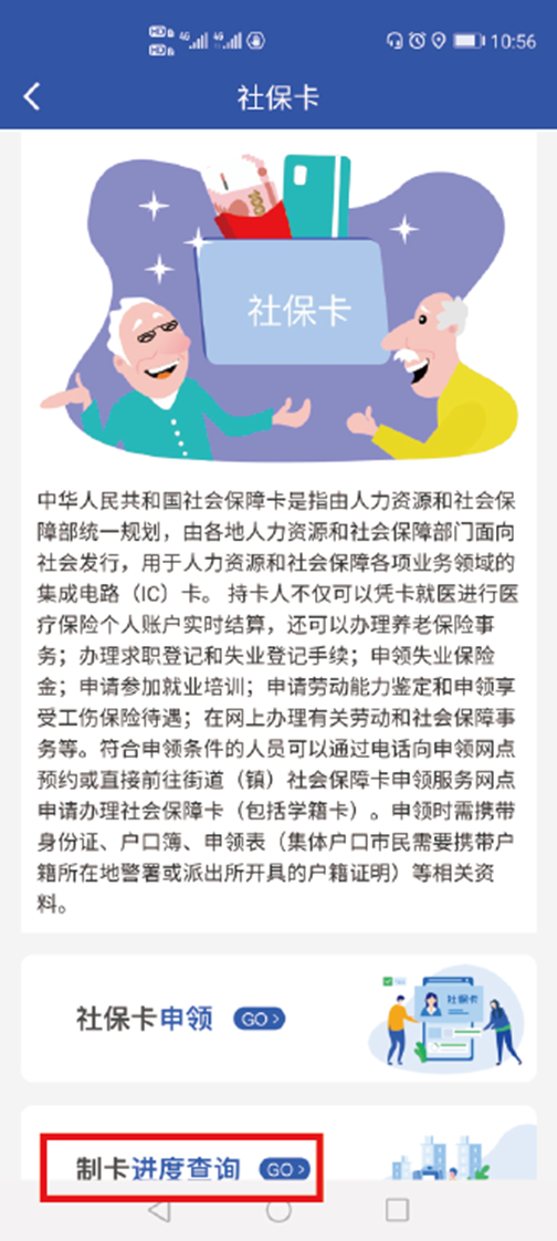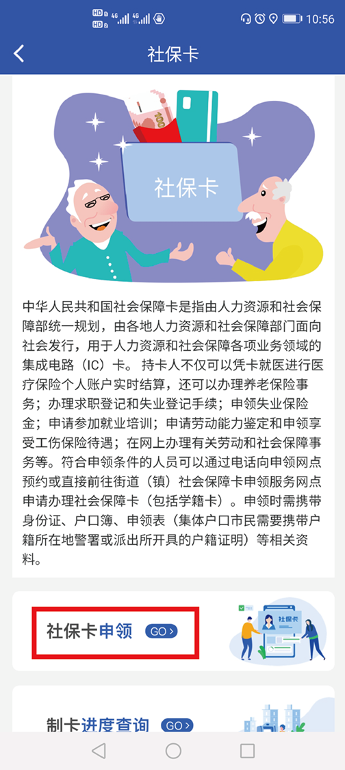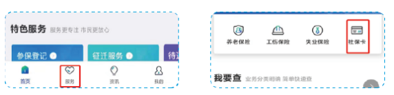 点击首页下方【服务】图标,进入【服务】页面选择【社保卡】,进入社保卡页。