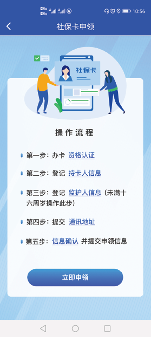 1.点击【社保卡申领】——查看社保卡申领步骤--对申领人进行身份认证(同第四步1-3)