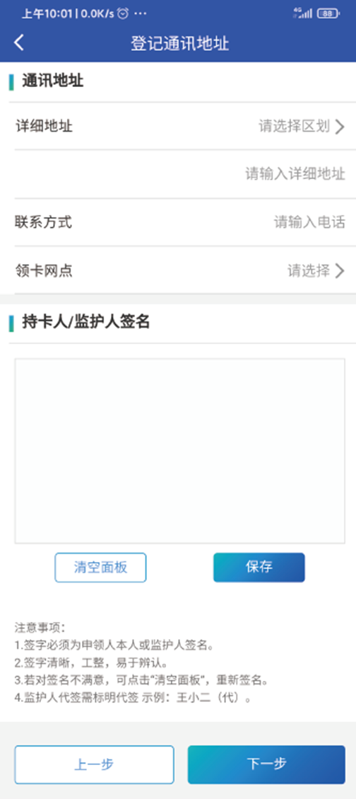4.登记通讯地址——确认填写信息无误后提交申请,如提交成功进入【提交】成功页面(同第四步5-6)。