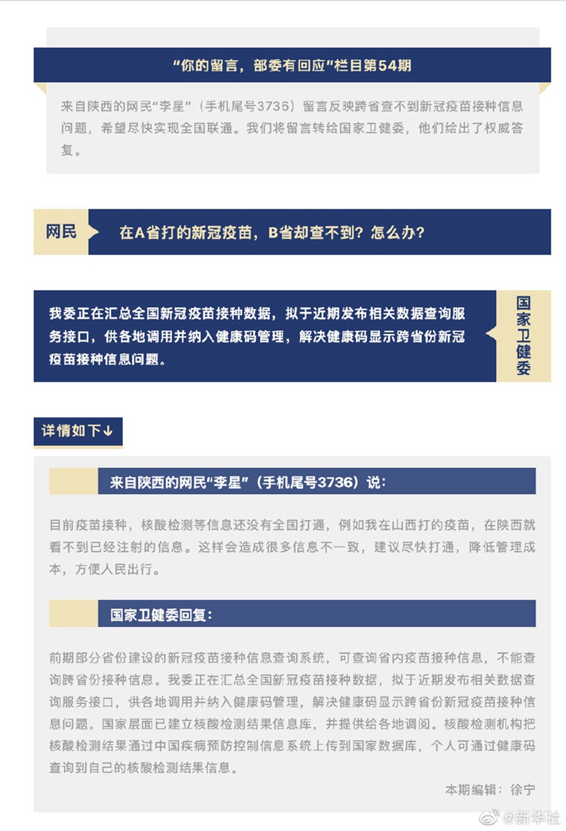 据“中国政府网”微信公众号“你的留言,部委有回应”栏目22日消息,针对网友反映的部分省份无法查询跨省新冠疫苗接种信息问题,国家卫健委表示,前期部分省份建设的新冠疫苗接种信息查询系统,可查询省内疫苗接种信息,不能查询跨省份接种信息。国家卫健委正在汇总全国新冠疫苗接种数据,拟于近期发布相关数据查询服务接口,供各地调用并纳入健康码管理,解决健康码显示跨省份新冠疫苗接种信息问题。国家层面已建立核酸检测结果信息库,并提供给各地调阅。核酸检测机构把核酸检测结果通过中国疾病预防控制信息系统上传到国家数据库,个人可通过健康码查询到自己的核酸检测结果信息。
