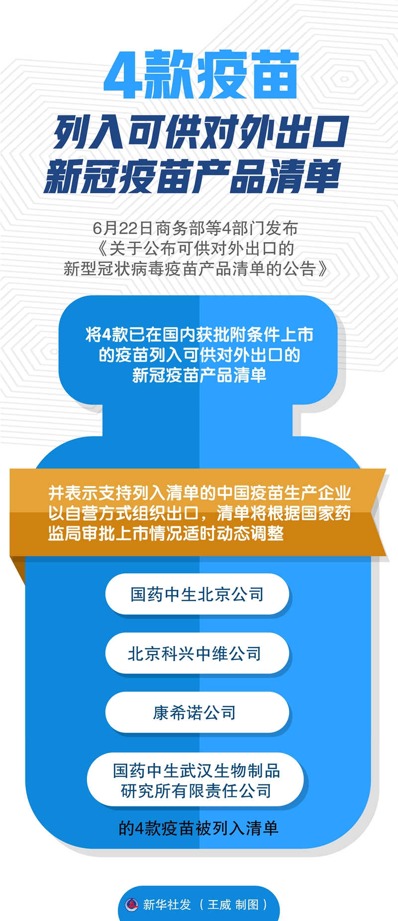 新华社北京6月22日电(记者于佳欣)商务部等4部门22日发布公告,将4款已在国内获批附条件上市的疫苗列入可供对外出口的新冠疫苗产品清单,并表示支持列入清单的中国疫苗生产企业以自营方式组织出口,清单将根据国家药监局审批上市情况适时动态调整。