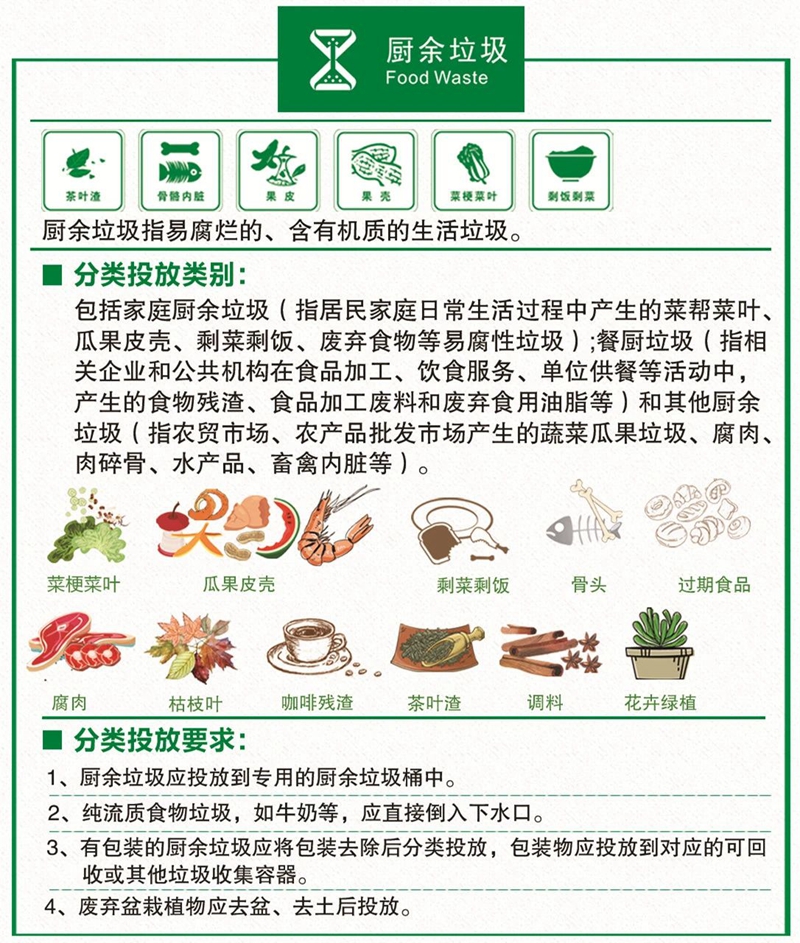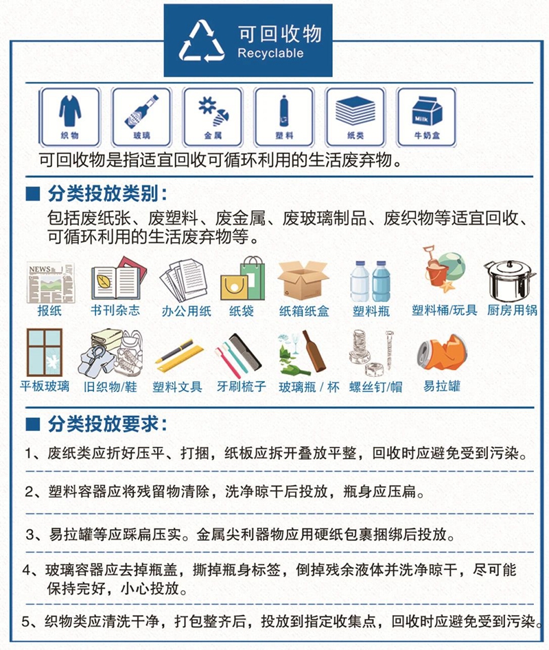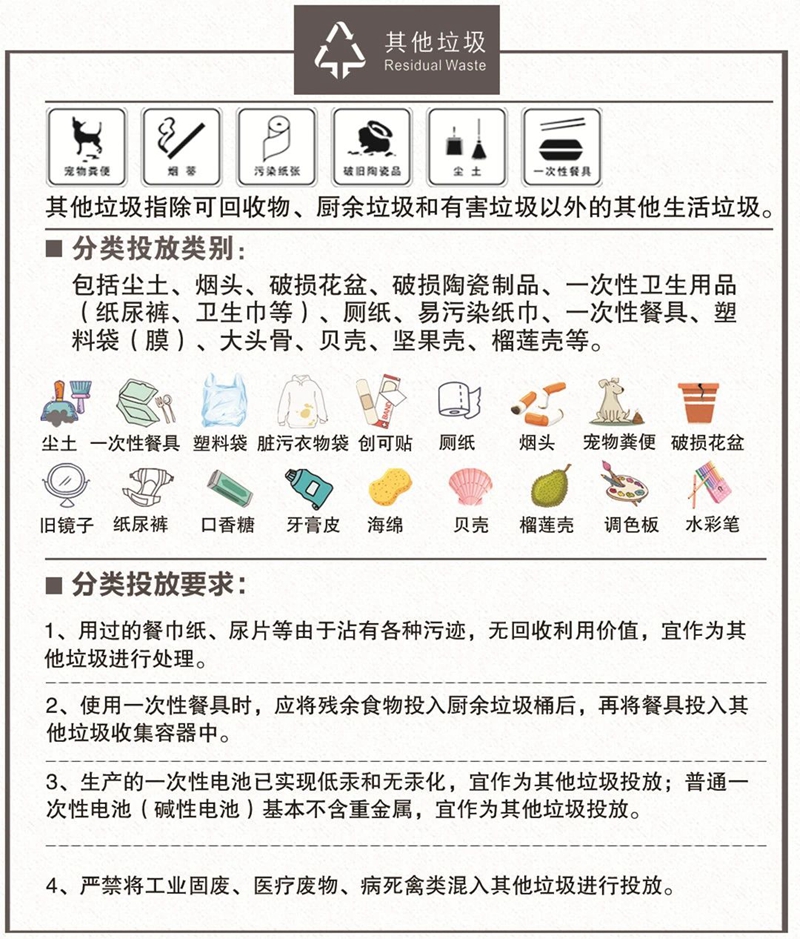 参照《生活垃圾分类标志》(GB/T19095-2019),公共机构生活垃圾区分为可回收物、有害垃圾、餐厨垃圾和其他垃圾。投放垃圾时要分清哦!