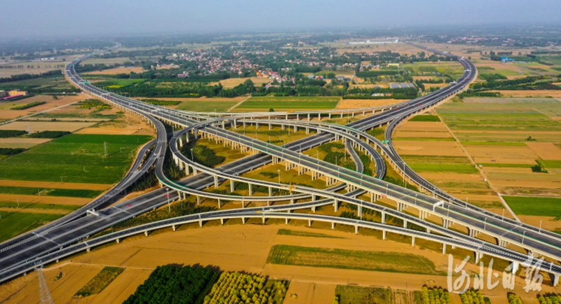 无人机航拍京雄高速公路河北段与荣乌高速新线交汇的泗庄枢纽互通。5月29日,雄安新区京雄高速公路河北段、荣乌高速新线、京德高速公路一期工程同期建成通车。至此,连同既有的京港澳、大广、荣乌、津石4条高速共同构成的“四纵三横”雄安新区对外高速公路骨干路网全面形成,雄安新区与京津冀实现全面快速联通,大规模建设画卷加速铺展。河北日报记者耿辉 摄