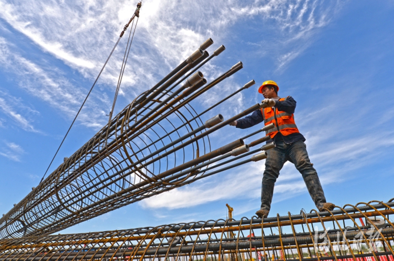 蓝天白云下,建设者为雄安新区的建设挥洒汗水。河北日报记者赵海江 摄