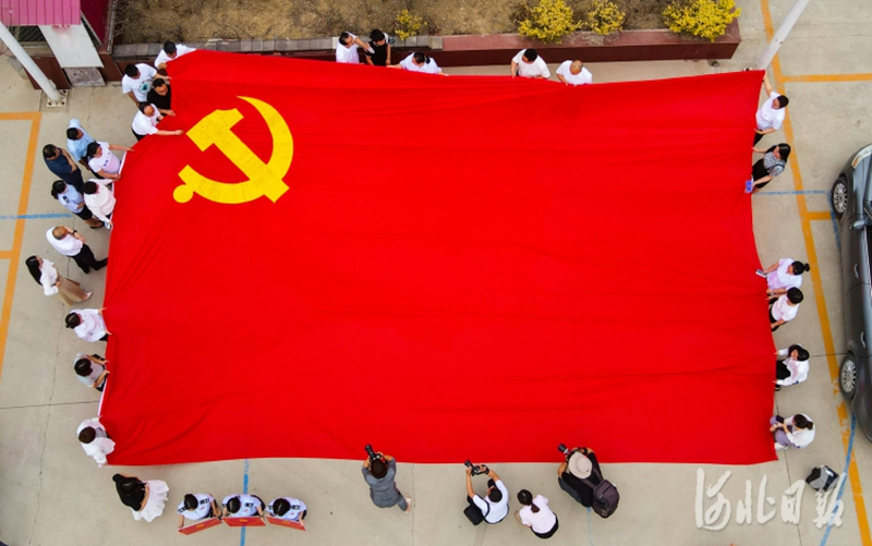 6月9日,雄安新区的建设者们同心接力绣党旗。河北日报记者耿辉 摄