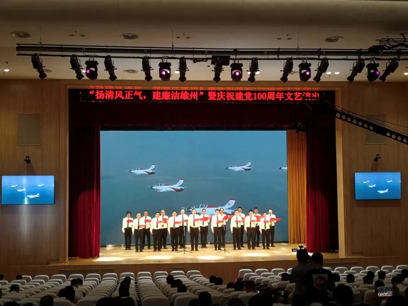 演出在鹰爪翻子拳青少年武术表演中拉开序幕,歌曲《党旗更鲜艳》《我和我的祖国》表达了时刻听党话、永远跟党走的坚定信念和对祖国的热爱之情,《雄起雄安》唱出了对新区美好生活的祝福;《党史在我们心中闪光》《持法律之刃、守廉洁之心》《雄安纪检监察之歌》等参演作品诠释了牢记党的初心使命,践行“忠诚干净担当”的郑重承诺。