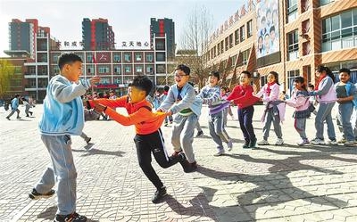 北京市海淀区中关村第三小学雄安校区的学生在课间玩游戏。