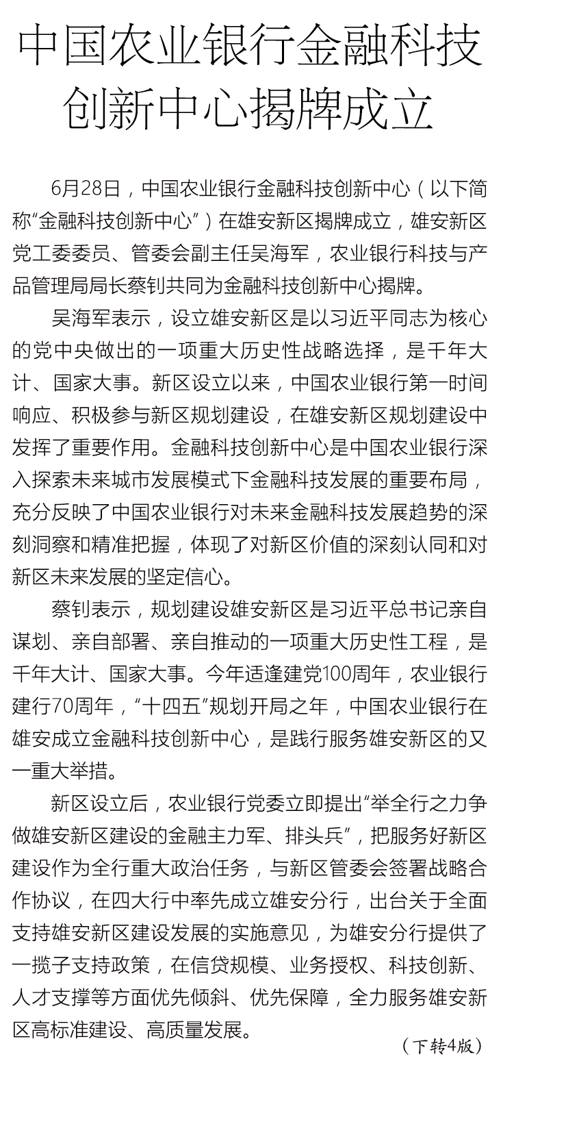 【雄安之声】中国农业银行金融科技创新中心揭牌成立